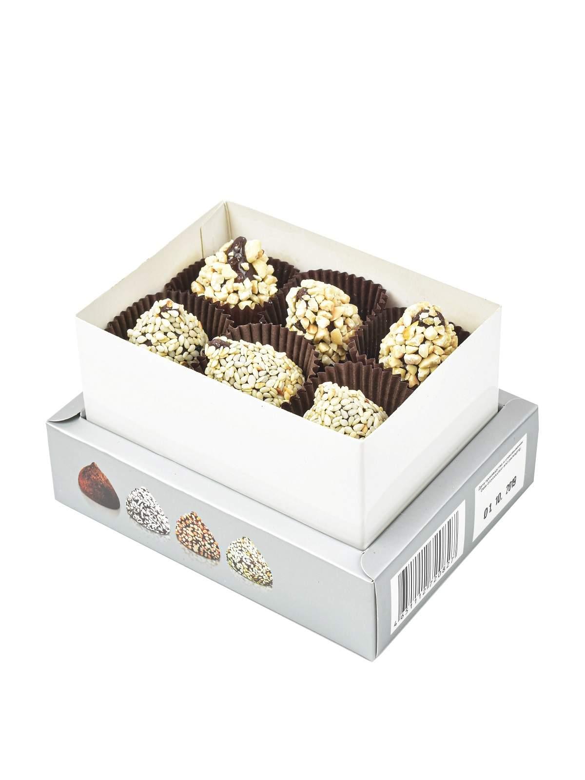 сахар, какао тёртое, жир кондитерский (рафинированные дезодорированные растительные масла: пальмовое, подсолнечное), какао масло, какао-порошок, молоко цельное сухое, сыворотка молочная сухая, семена черного кунжута жаренного, какао-порошок алкализованный, кокосовая стружка, вафельная крошка: (мука пшеничная, сахар, масло растительное рафинированное дезодорированное - смесь рапсового и подсолнечного, молочный жир, лактоза, молочный белок, соль, экстракт ячменного солода, разрыхлитель: гидрокарбонат натрия; эмульгатор: лецитин из подсолнечника; антиокислитель: токоферолы, концентрат смеси) эмульгаторы: лецитин соевый, моно- и диглицериды жирных кислот, эфиры полиглицерина; ароматизаторы: ванилин, горький шоколад, сливочный.