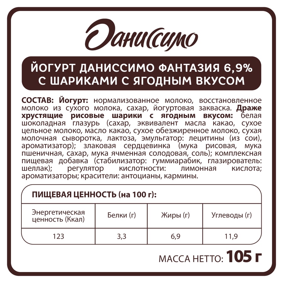 Йогурт Даниссимо Фантазия с шариками с ягодным вкусом 6,9%, 105 г