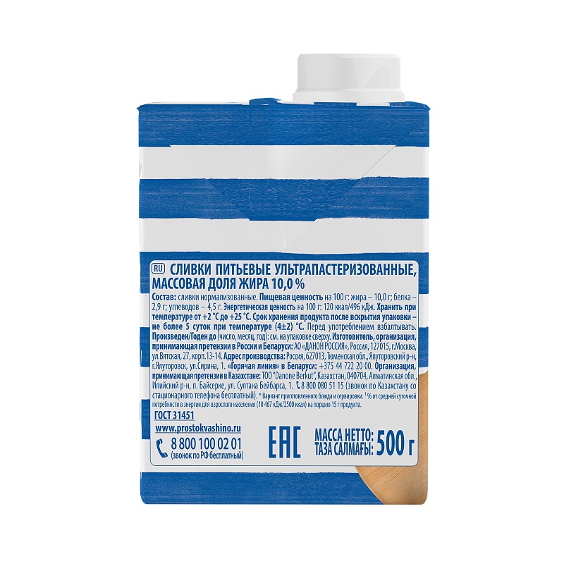 Сливки питьевые Простоквашино ультрапастеризованные 10%, 500 г