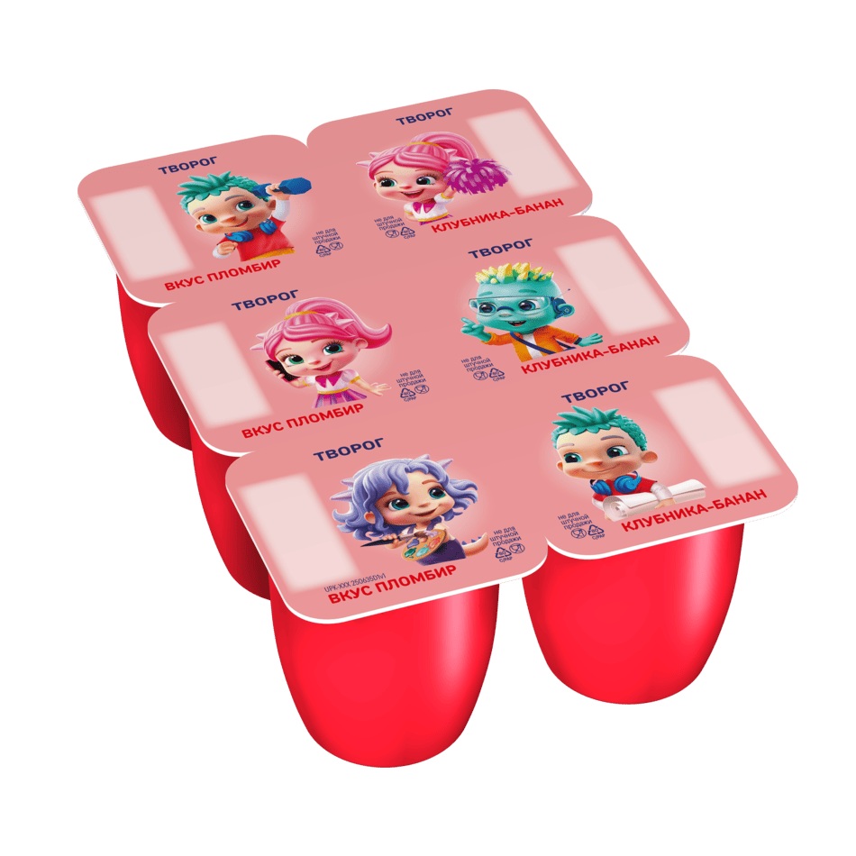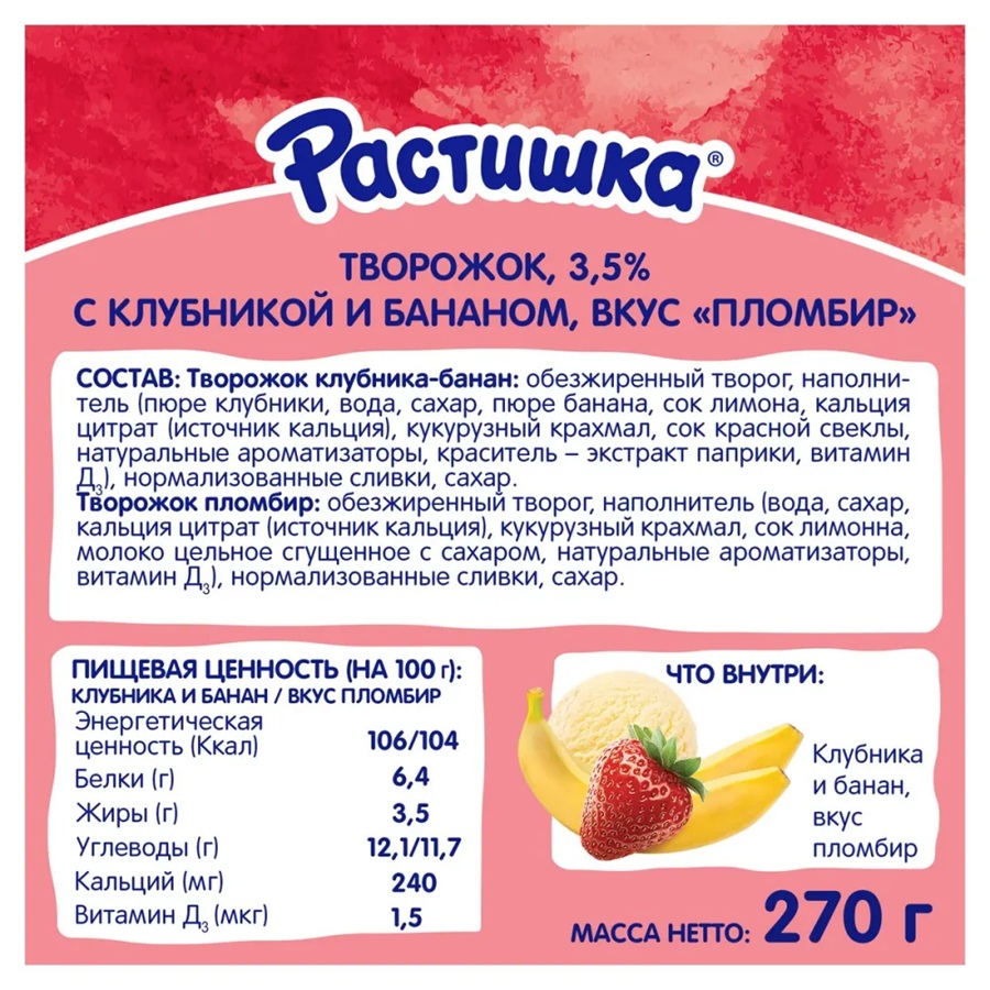 Творог Растишка с клубникой и бананом, вкус пломбир 3,5%, 270 г (6 шт х 45 г)