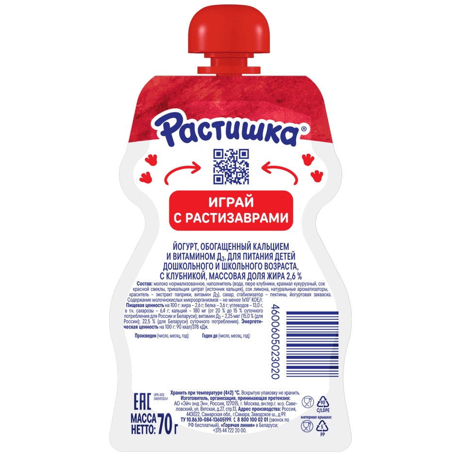 Йогурт питьевой Растишка с клубникой 2,6%, 70 г